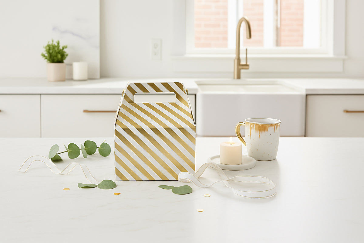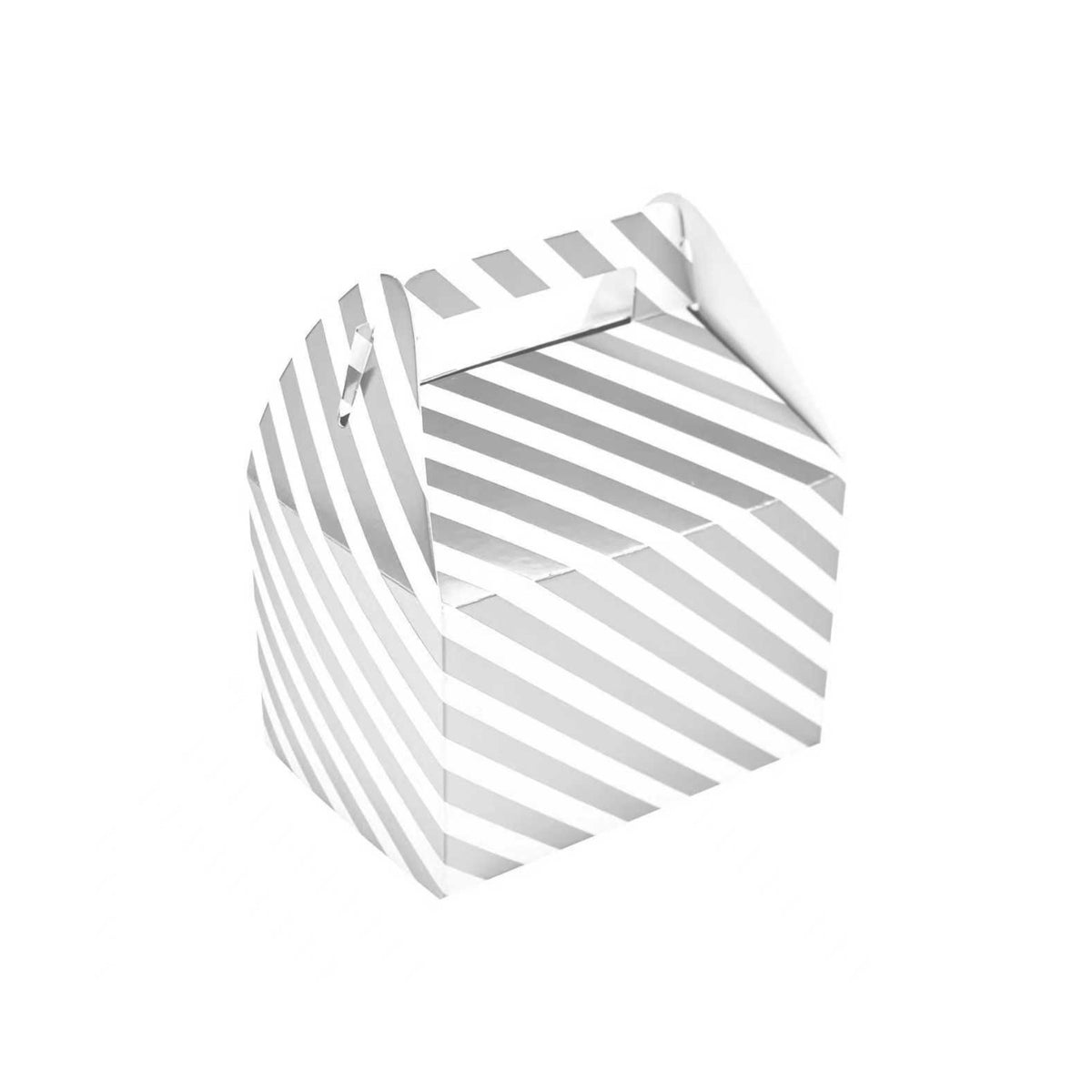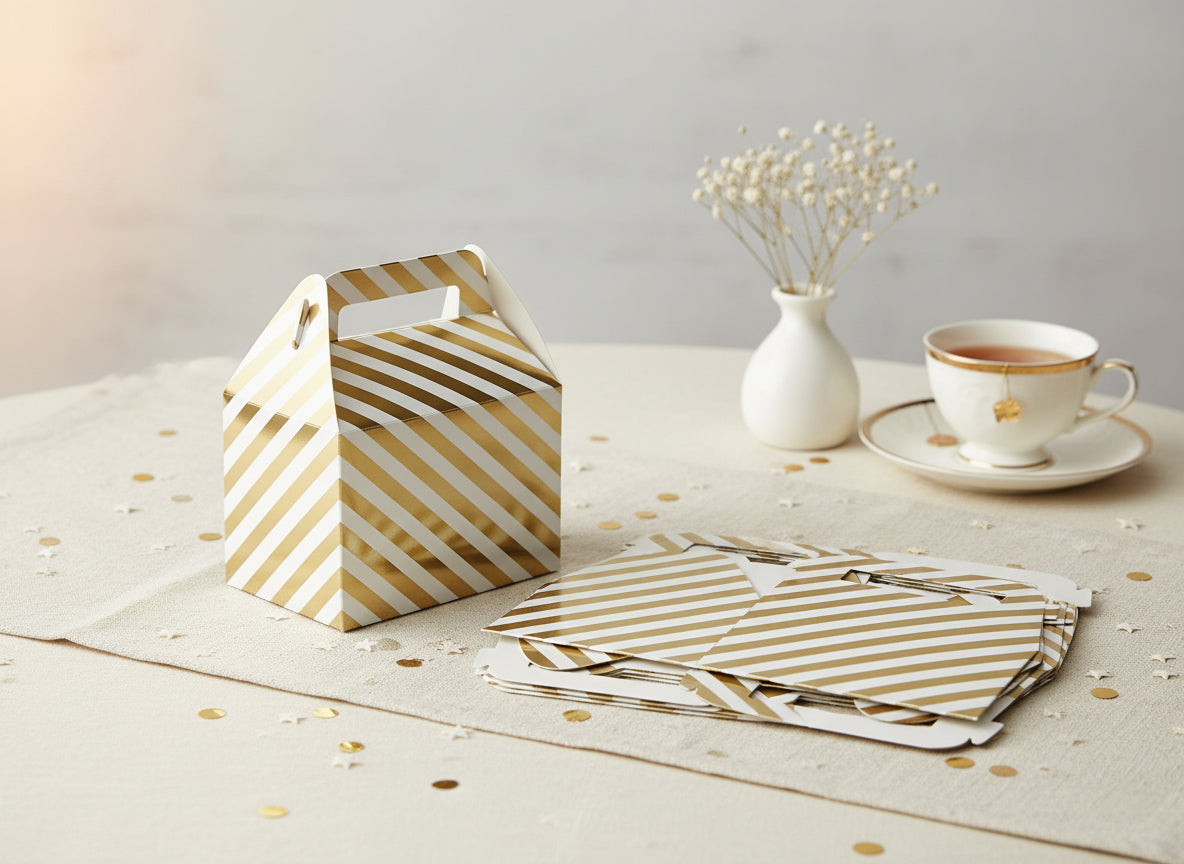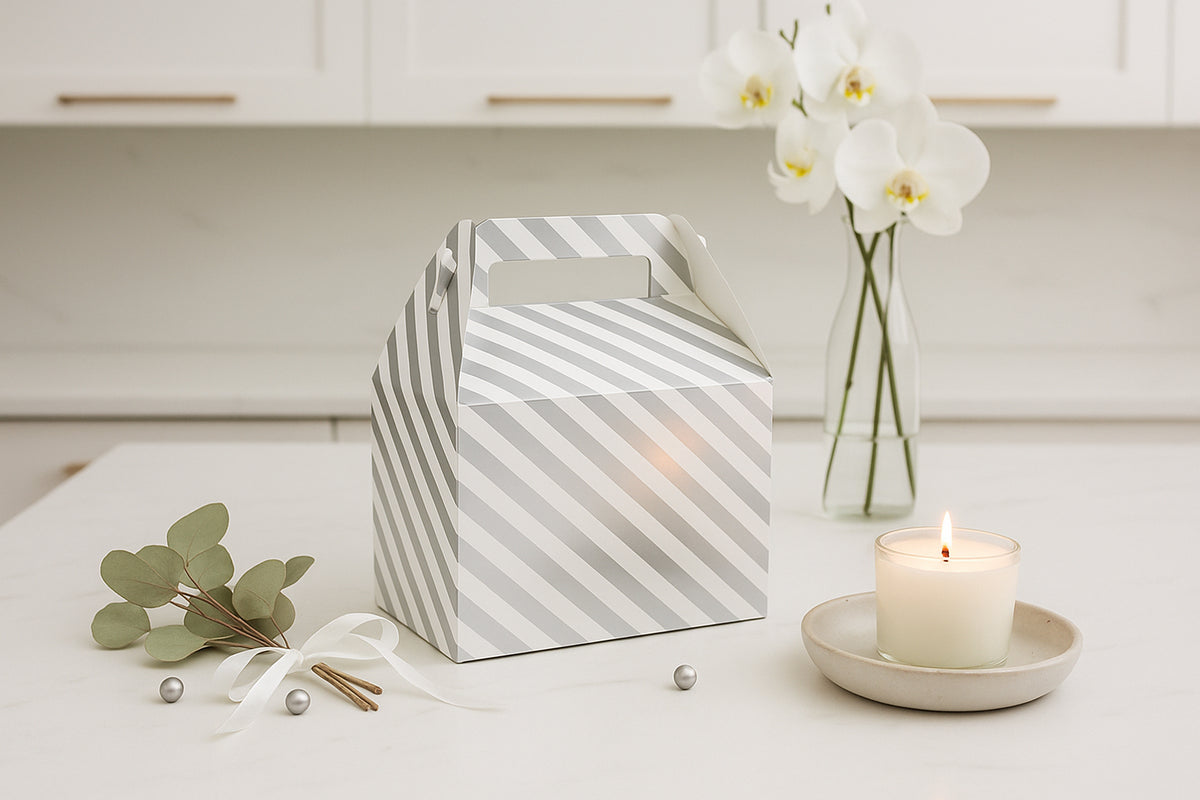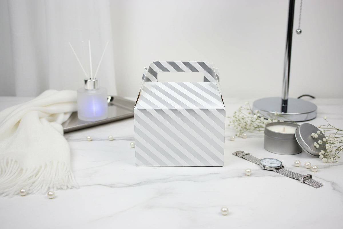 - π Stylish Gable Gift Boxes β Eye-catching diagonal striped design with built-in handle for easy carrying.