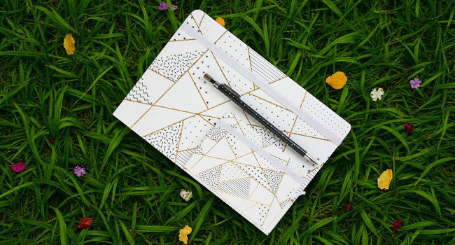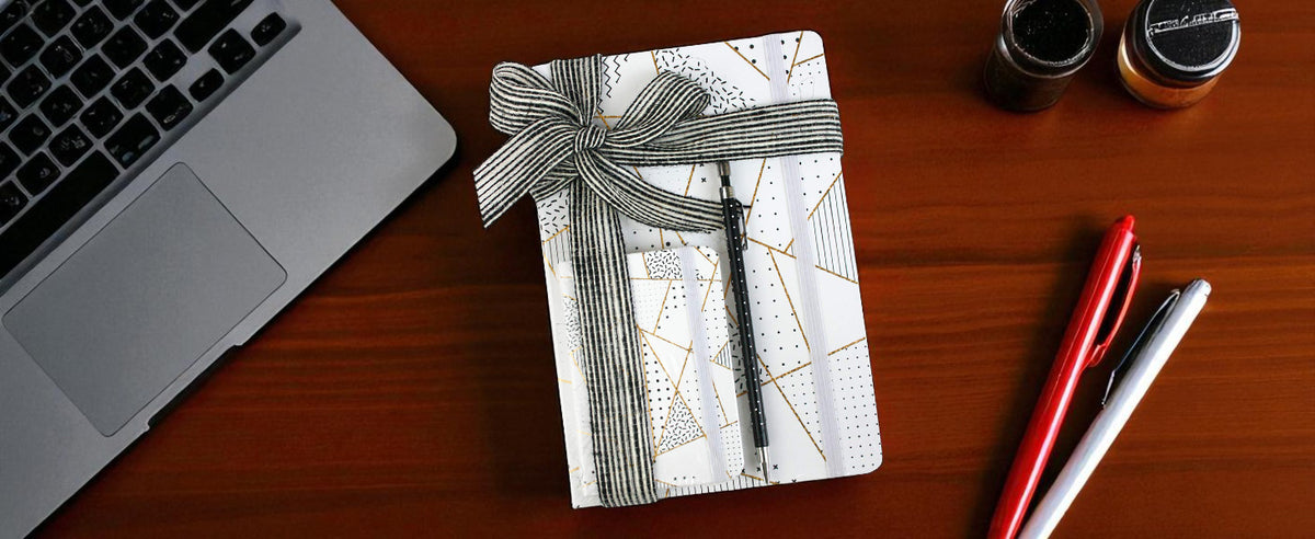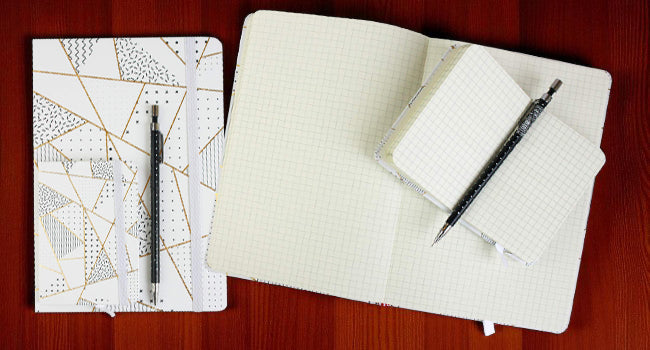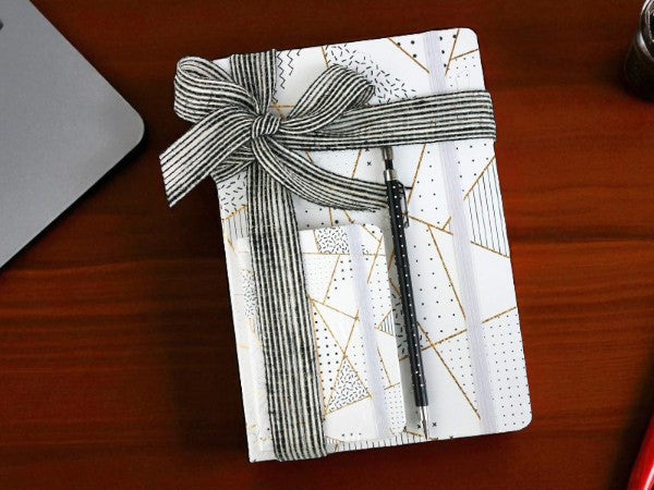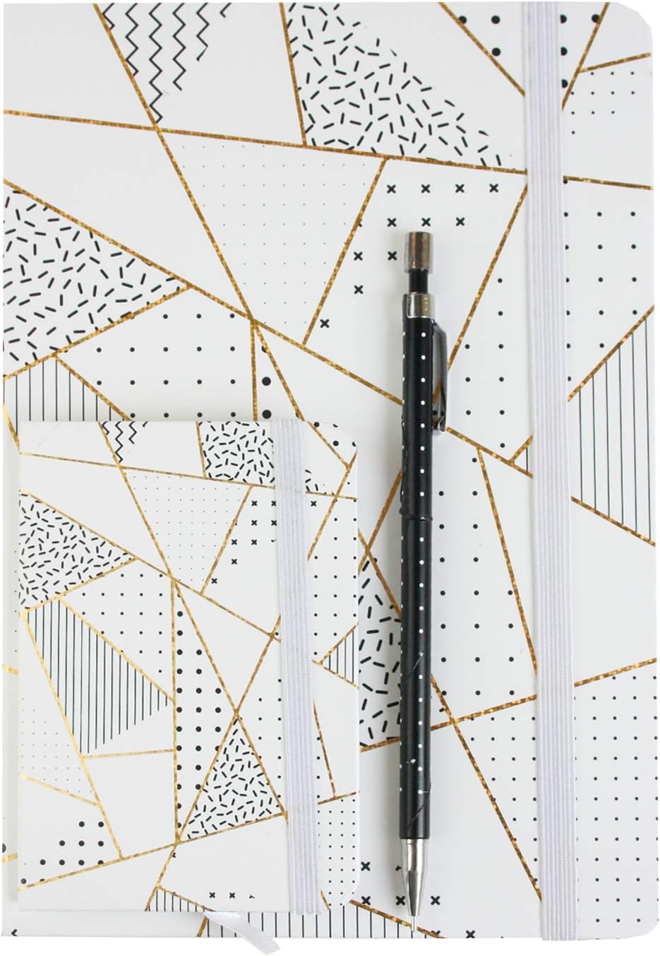 Unique Gift Set with A5 Notebook, A7 Notebook, Mechanical Pencil and Ribbon - Geometric Marble White/Gold