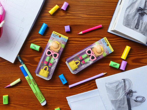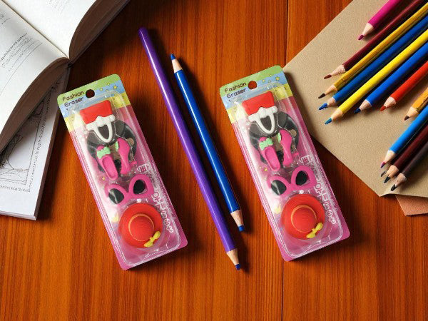 - Fashion-Themed Erasers: Each set includes stylish erasers shaped like fashionable items such as hats, sunglasses, shoes, and accessories.