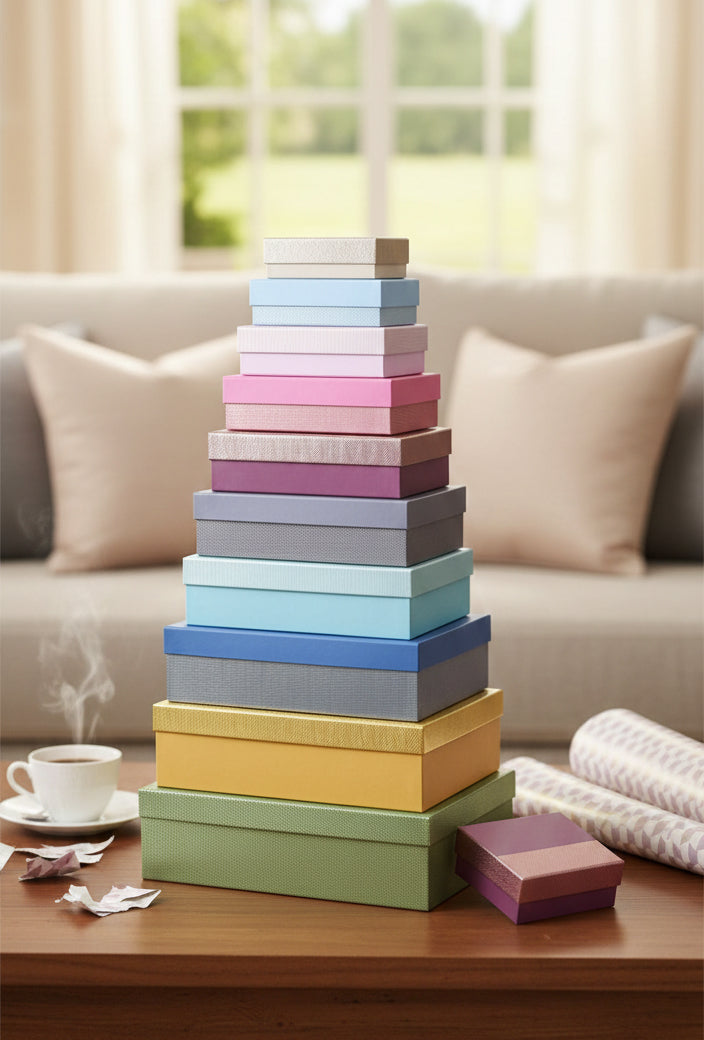 Includes 10 beautifully printed rigid gift boxes with lids, designed in graduated sizes for a premium nested presentation. Ideal for luxury gifting, retail packaging, corporate hampers, event favors, weddings, birthdays, Christmas, and special occasions. -