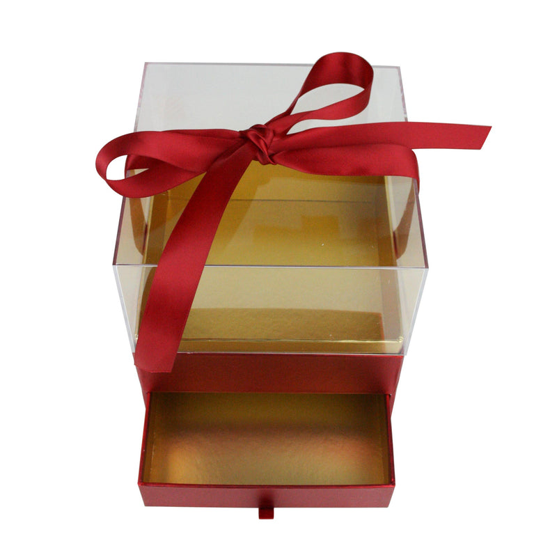 Elegant Clear Lid Gift Box with Ribbon and Drawer for Special Occasions - Red/Gold